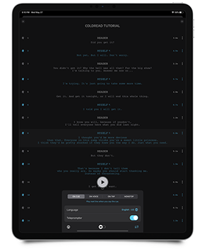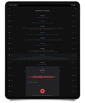 When you say the very last word of your line (the cue), coldRead will “read” the following line back to you, just like a real reader would.